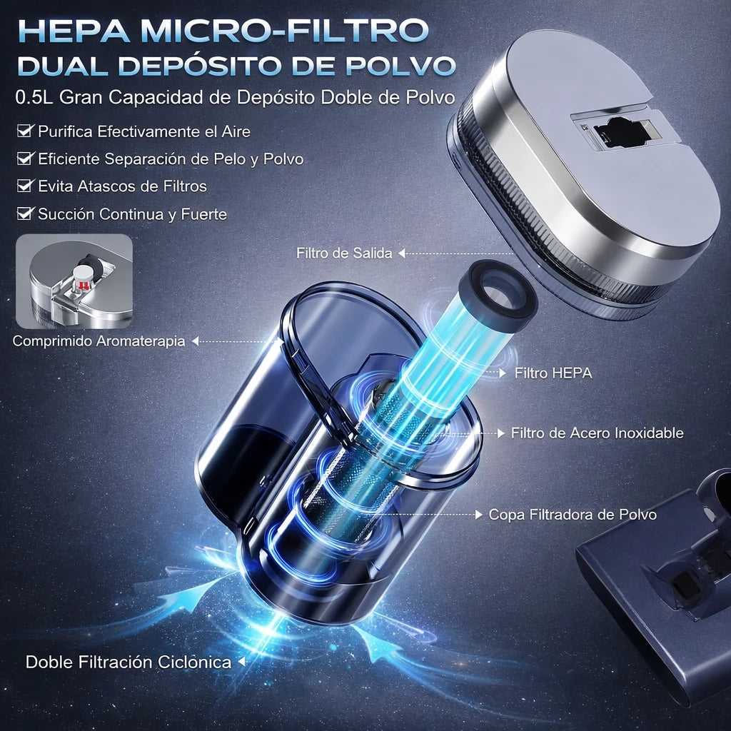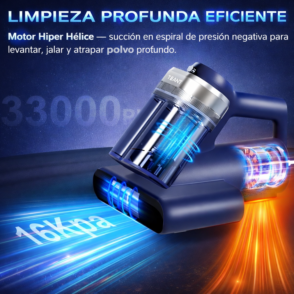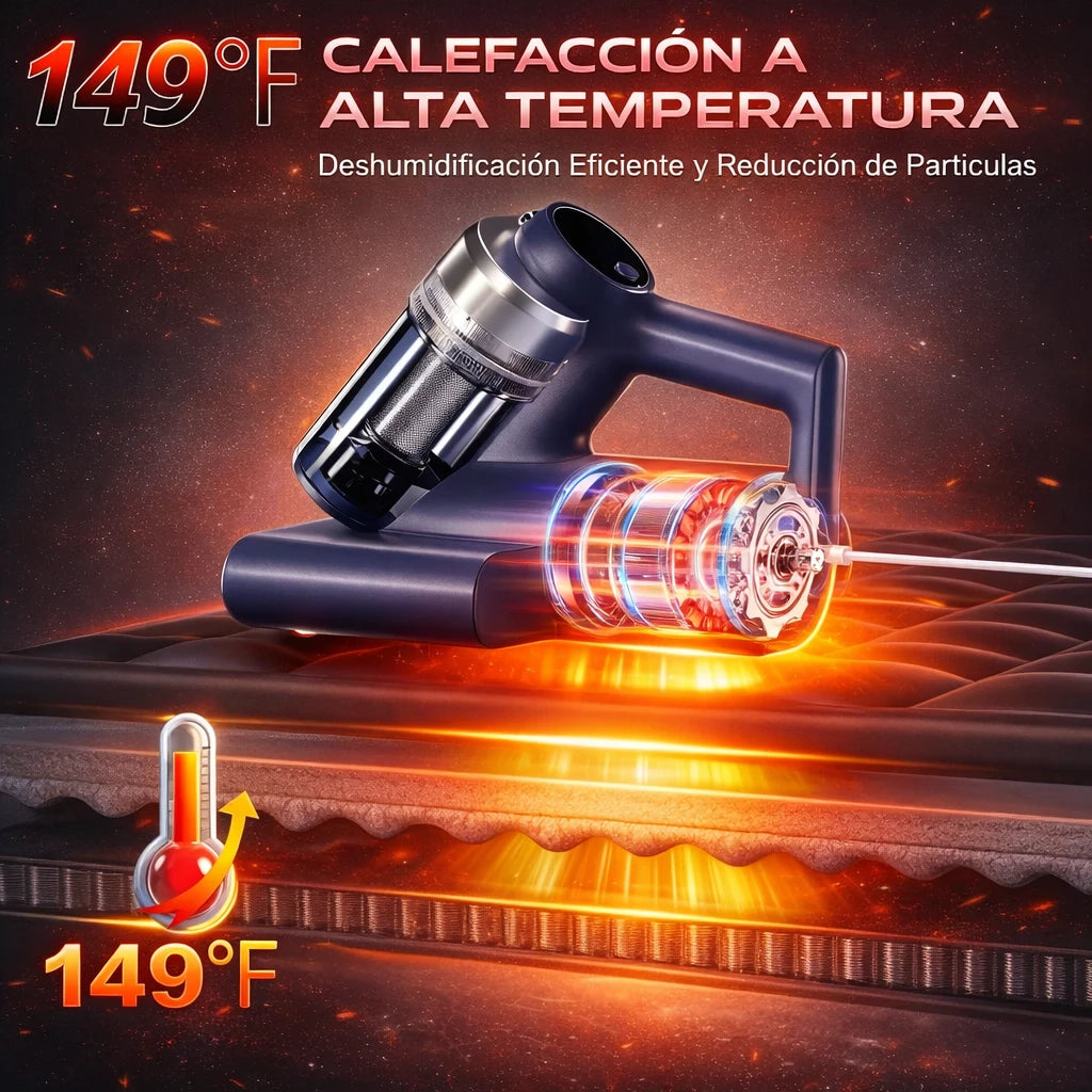 Sí. Su tecnología de succión profunda y luz UV elimina hasta el 99% de los ácaros, bacterias y polvo escondidos en colchones, sofás y almohadas.